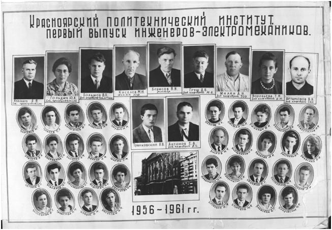 В течение первого года существования КПИ (1957) было открыто 9 общеобразовательных кафедр. Среди них была кафедра Общей и теоретической электротехники, первый заведующий доцент Жилин Анатолий Николаевич (на фото первого выпуска инженеров-механиков – третий справа в верхнем ряду). В последствии заведующими кафедрой были: старший преподаватель Ю.Л.Гольдич (на фото первого выпуска инженеров-механиков – вторая слева в верхнем ряду), к.т.н., доцент В.М.Петров, д.т.н., профессор Я.И.Бульбик, профессор Ю.С.Перфильев.
