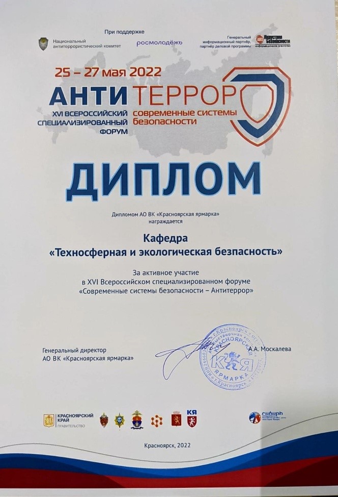 В Красноярске в МВДЦ «Сибирь» прошел XVI Всероссийский специализированный форум «Современные системы безопасности – Антитеррор». На выставочной площадке МЧС был размещен стенд кафедры «Техносферная и экологическая безопасность».